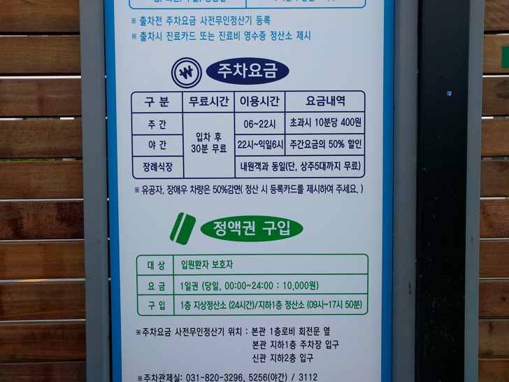 - 만약 입원환자의 보호자라면 하루 만원에 하루종일 주차가 가능하다. 정액권 구입 시 환자 정보를 알려줘야 한다.