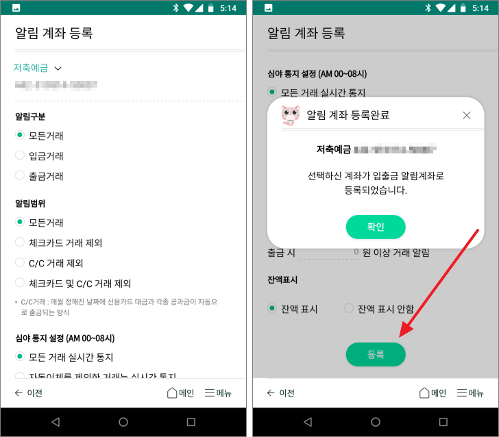 어떤 거래에 대해서 알림을 받을지 정하고 등록을 누르면 드디어 완료가 됩니다.